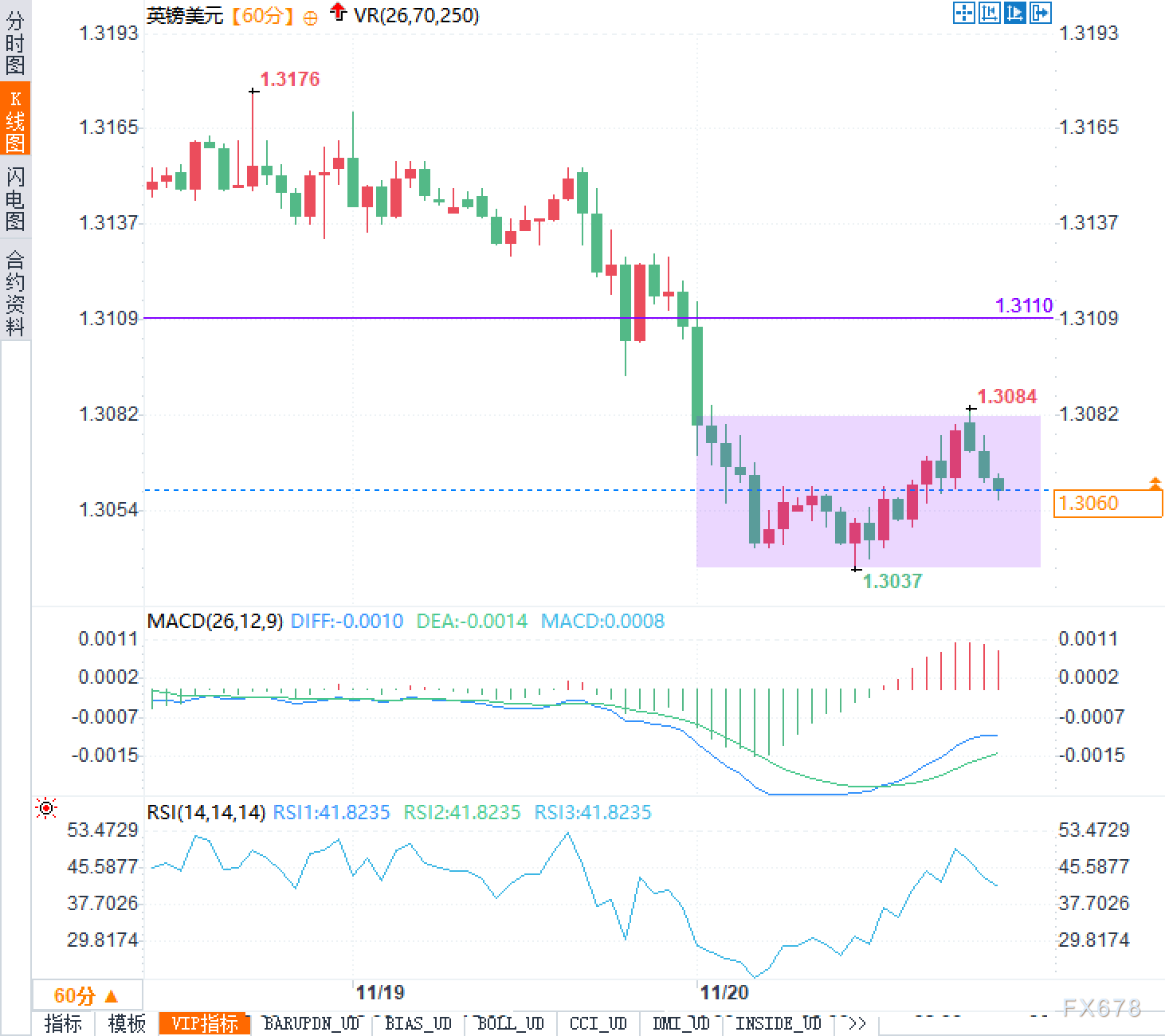 从60分钟图看,英镑兑美元自1.3176高位回落,跌破1.3110一线后进入1.3037至1.3084的窄幅震荡区间。当前价格1.3060,位于区间中部,短线多空力量大致均衡。