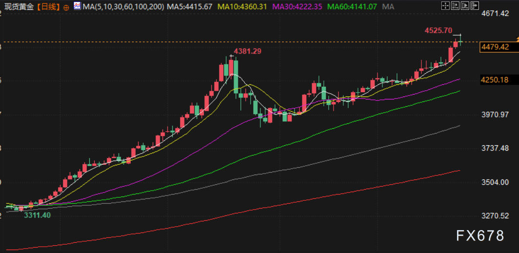 汇通财经APP讯——周四因圣诞假期,市场交投清淡,现货黄金周三早盘突破每盎司4500美元关键关口,创下4525.70
